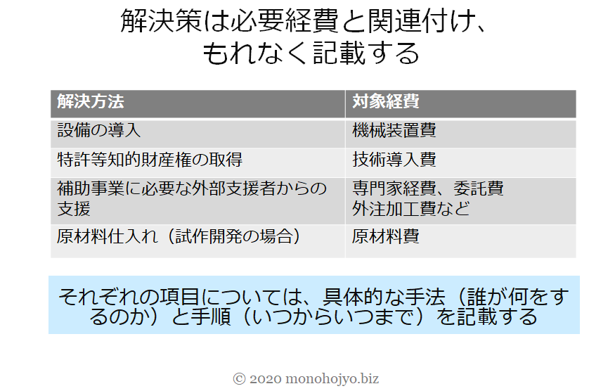 • ものづくり補助金は、解決策に対して補助される制度。つまり解決方法を「明確に」記載するとは、補助対象経費について説明することとほぼ同意