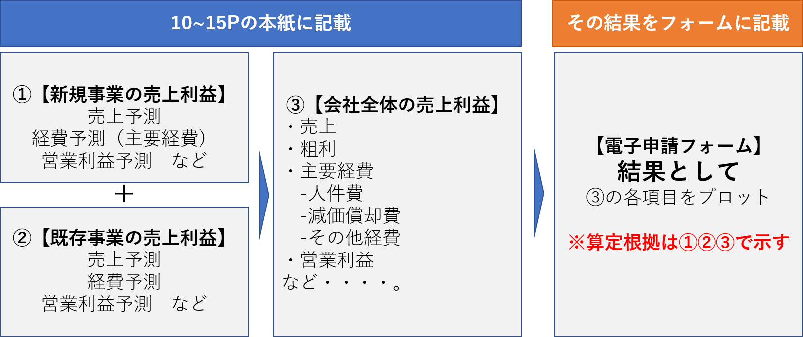 でも「算定根拠を示す」という点については審査時の必須事項になっているので全体の事業計画に数字を入れるだけだと確実に点数は低くなるので注意が必要です。