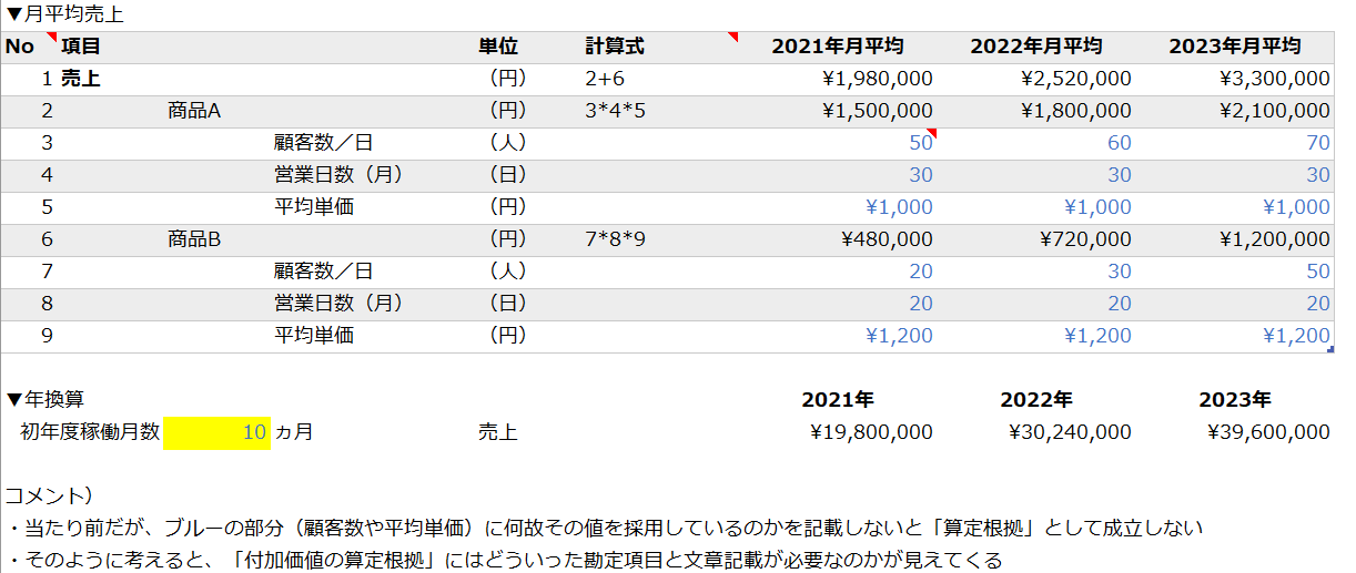 売上単価が1000円か2000円かで迷うことはあると思いますが、1000円か10000円かで迷うことはないでしょう。つまり、肌感覚で適当に入れてもさほど大きな差異はでないので、最初から細かいことを気にすることはないのです。先ずは項目を作っておいて、細かい数値は後から考えると良いのです。