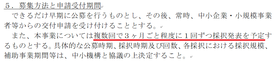 3か月ごとに1回採択発表を行うということは、年間4回の採択発表。つまり4次公募まで予定しているということになりますね。