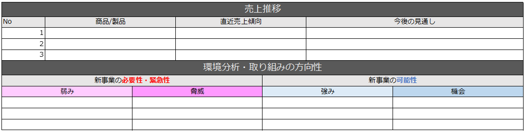 売上の減少という事実を補足するのが、環境分析のSWOT分析でいう弱み(Weakness)・脅威(Thread)です。売上減少の事実だけでは、事業再構築を行う必要性や緊急性の高さを伝えることは出来ないので補足が必要ですよね。