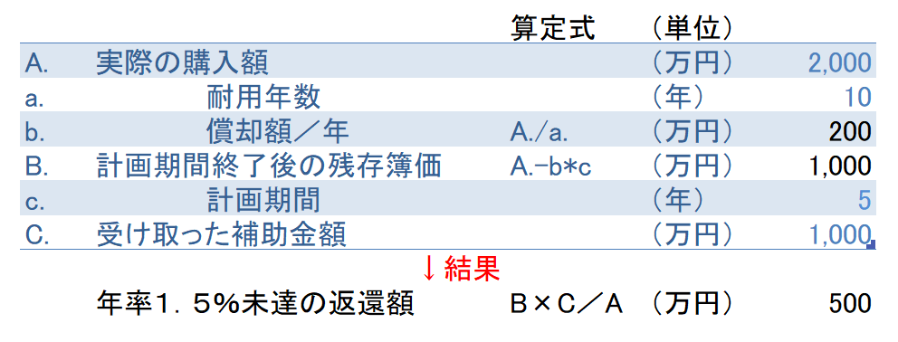 事業計画終了時点において、給与支給総額の年率平均1.5%以上増加目標が達成できていない場合は、導入した設備等の簿価又は時価のいずれか低い方の額のうち補助金額に対応する分(残存簿価等×補助金額/実際の購入金額)の返還を求めます。